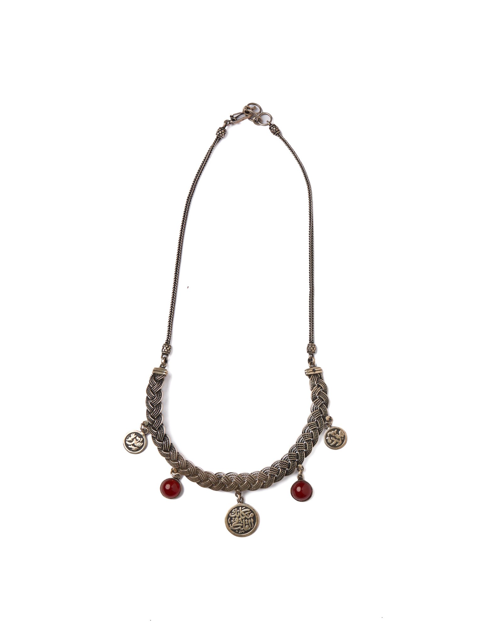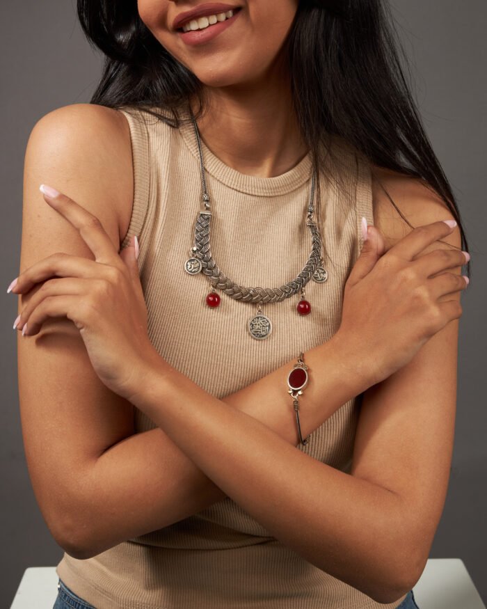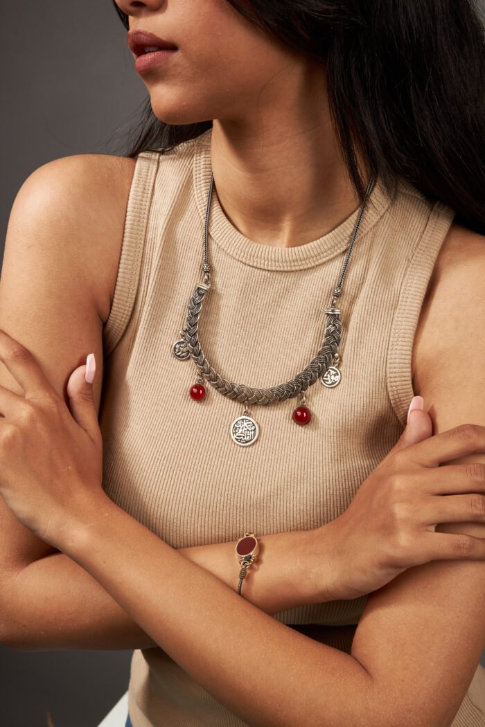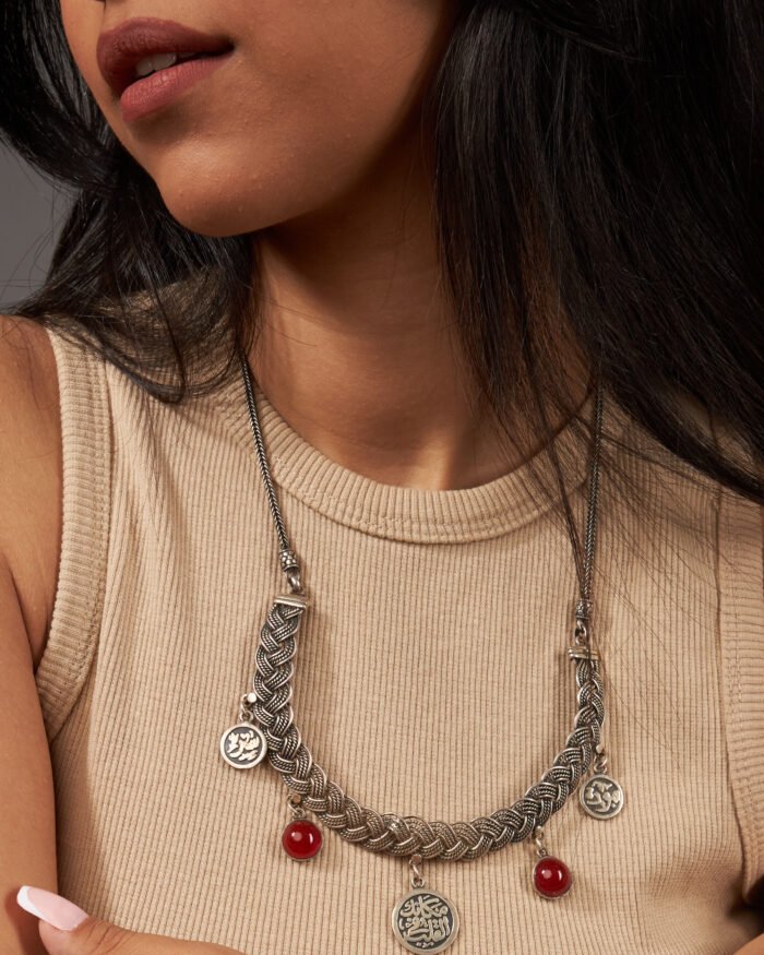 An elegant necklace crafted from 925 sterling silver, engraved with a heartfelt Arabic phrase: “Protection and your place is in the heart.” A meaningful piece that blends beauty and emotion—perfect for gifting or keeping close as a personal expression.