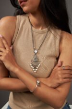 A delicate piece crafted from 925 sterling silver, measuring 52 cm in length. Inspired by the timeless Arabic phrase “Enta Omri” (You are my life), this necklace blends elegance with deep emotional meaning.