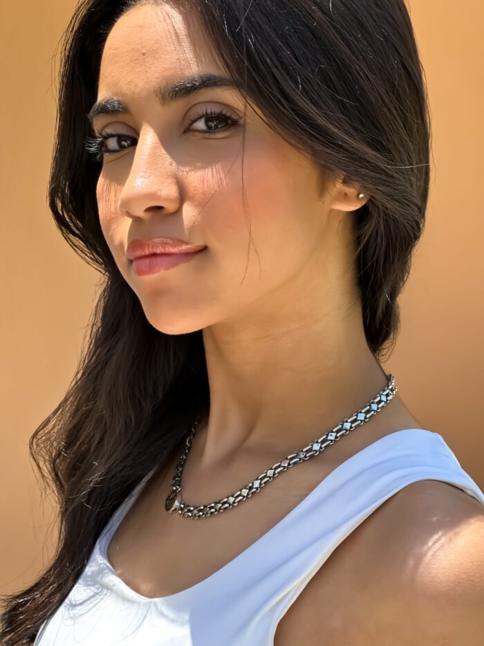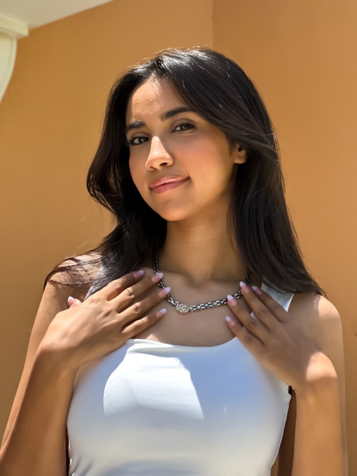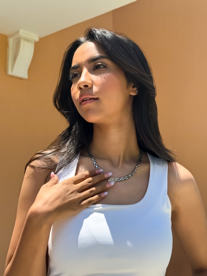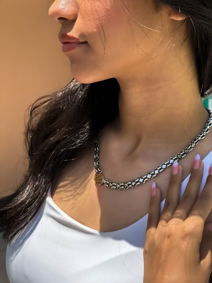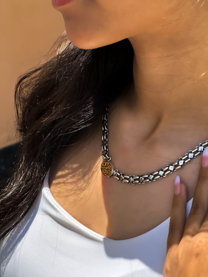 A powerful fusion of modern edge and cultural grace. This handcrafted necklace features a thick silver chain paired with a round brass charm engraved in elegant Arabic calligraphy. The contrast between the silver and brass centerpiece makes this piece deeply meaningful.