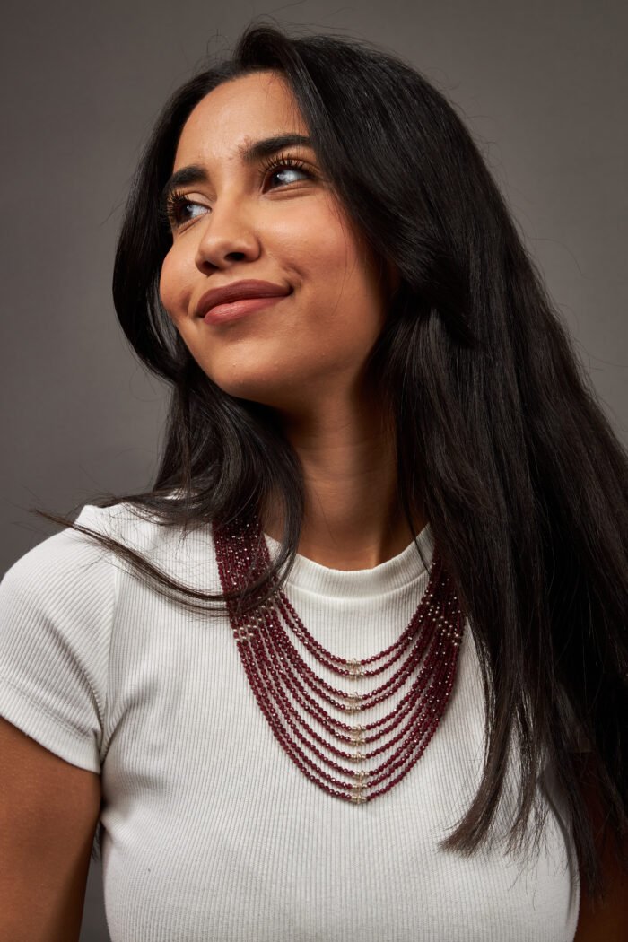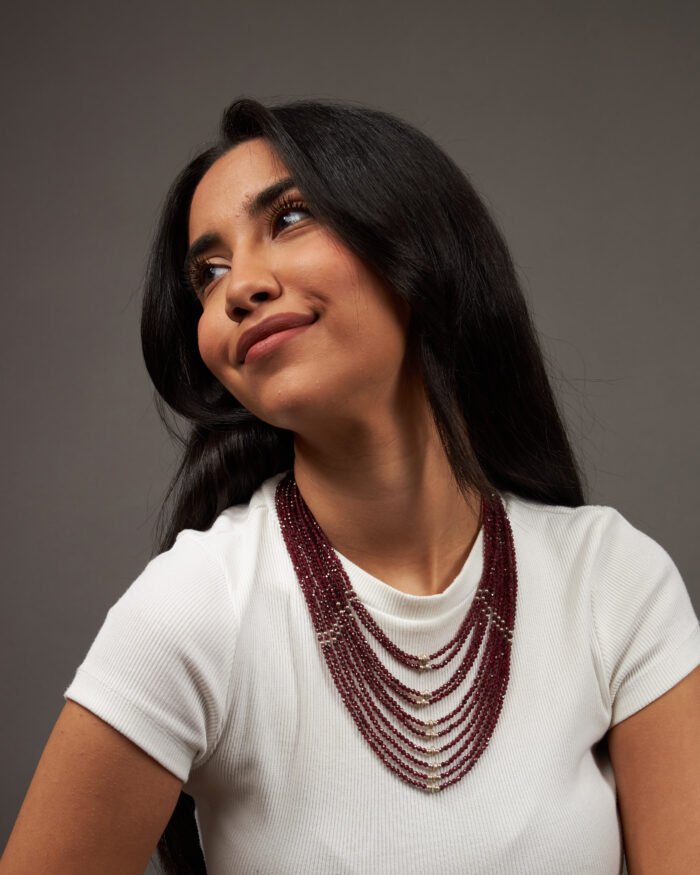 سلسلة متعددة الطبقات بتصميم فاخر، تتكون من خيوط متتالية من الخرز البني المحمر تتخللها فواصل معدنية أنيقة تضيف لمسة من التباين والبريق. تصميمها الجريء والمميز يجعلها قطعة لافتة مثالية للمناسبات الخاصة أو لإضفاء طابع أنيق على الإطلالة اليومية