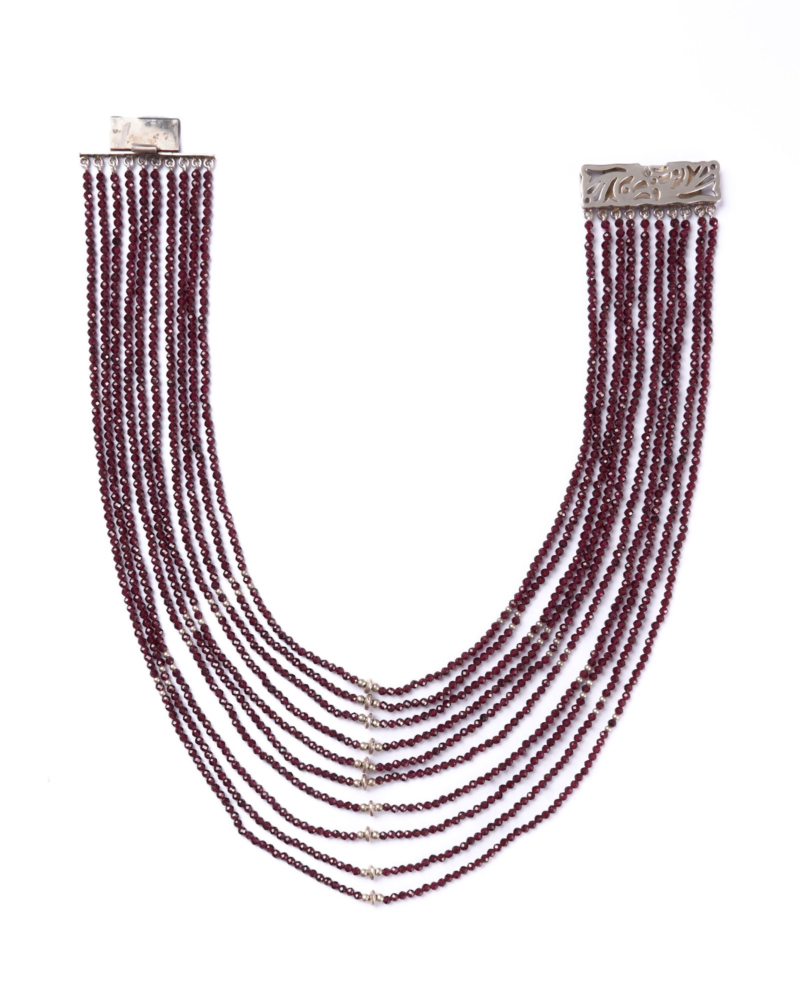 A luxurious layered necklace featuring cascading strands of deep reddish-brown beads accented with metallic spacers for a touch of contrast and shine. Its bold, elegant design makes it a standout piece—perfect for special occasions or adding a sophisticated flair to everyday looks.
