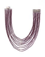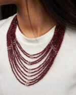 سلسلة متعددة الطبقات بتصميم فاخر، تتكون من خيوط متتالية من الخرز البني المحمر تتخللها فواصل معدنية أنيقة تضيف لمسة من التباين والبريق. تصميمها الجريء والمميز يجعلها قطعة لافتة مثالية للمناسبات الخاصة أو لإضفاء طابع أنيق على الإطلالة اليومية