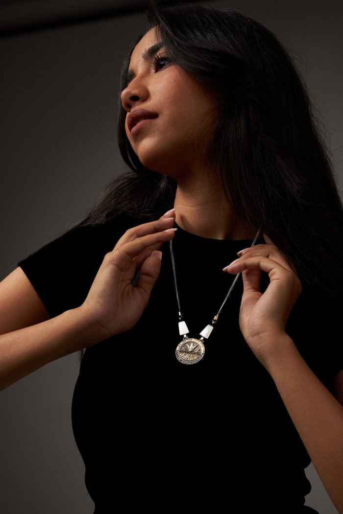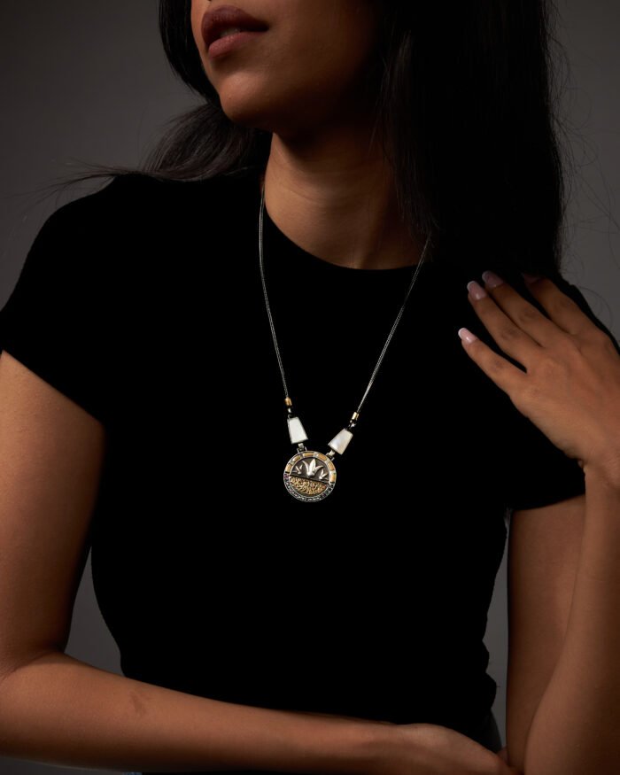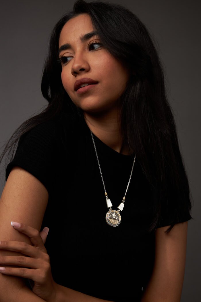 قطعة مجوهرات أنيقة مصنوعة من مزيج من فضة استرلينية عيار 925 ونحاس، بتصميم يجمع بين البساطة والتميز. مزيج المعادن يمنح القطعة تباينًا جذابًا ولمسة فنية متقنة، ما يجعلها مثالية للإطلالات اليومية أو المناسبات الخاصة