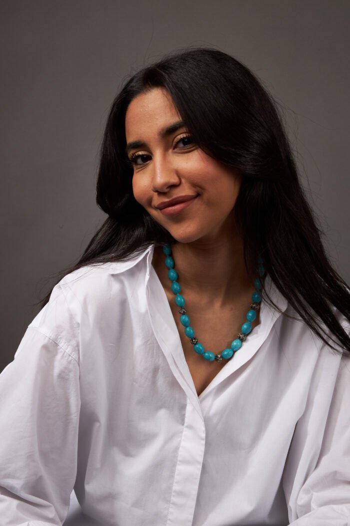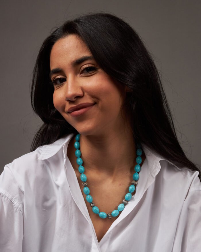 قطعة مجوهرات مميزة تجمع بين أحجار الفيروز الطبيعي والفضة الاسترلينية عيار 925، بتصميم مستوحى من الطبيعة يعكس الصفاء والحماية. يمنح حجر الفيروز لونًا هادئًا وفريدًا، بينما تضيف الفضة لمسة من الأناقة الكلاسيكية. مثالية لمن يبحث عن الجمال الطبيعي والمعنى العميق في قطعة واحدة